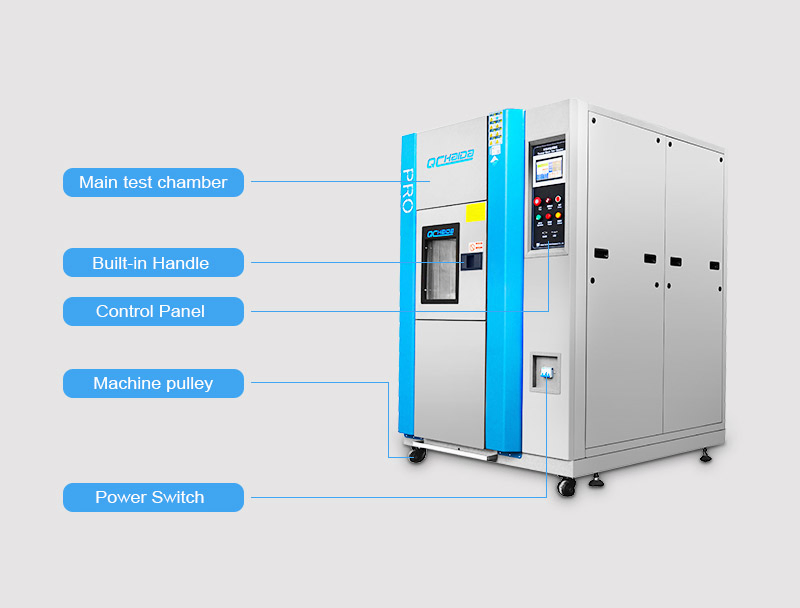 - Three chamber structures, high temperature chamber, low temperature chamber and test chamber, control automatically, stay and switch time adjustable.