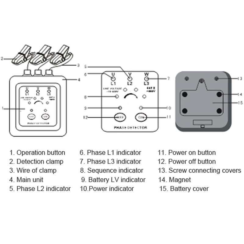 GDCR1000D non-contact phase tester is a major breakthrough in traditional phase sequence detection method. The traditional phase sequence detection is to strip the connection pole of three-phase wires, connect three bare clamps or test needles of phase sequence meter to three bare fire lines, while GDCR1000C and GDCR1000D adopt pincers non-contact induction measurement. The phase sequence can be detected by no need peeling off the wire and without touching the bare high-voltage fire wire, just directly clamping three super-inductive high-insulation clamps on the insulation skin of the three-phase fire wire respectively. At the same time, acousto-optic indication of the positive or reverse phase state of the phase sequence of the three-phase power supply can be obtained. There are four strong magnets on the back of the instrument, which can be attached to the distribution box for use.